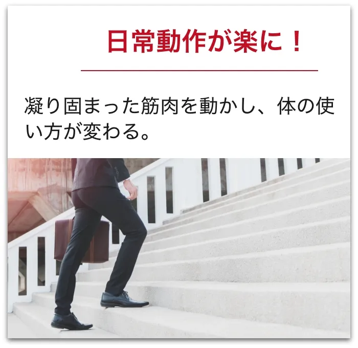 お体の状態に合わせて、お客様に最適なストレッチをおかけいたします。不快の要因となる筋肉をコアバランスストレッチで伸ばします。